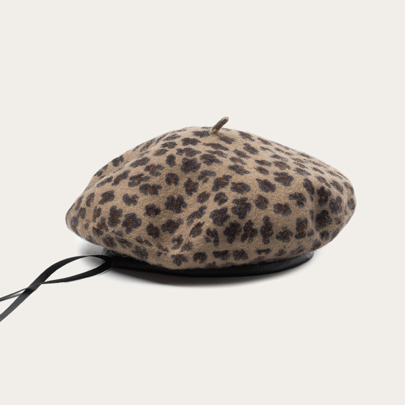 Print leopard print wool beret with adjustable border