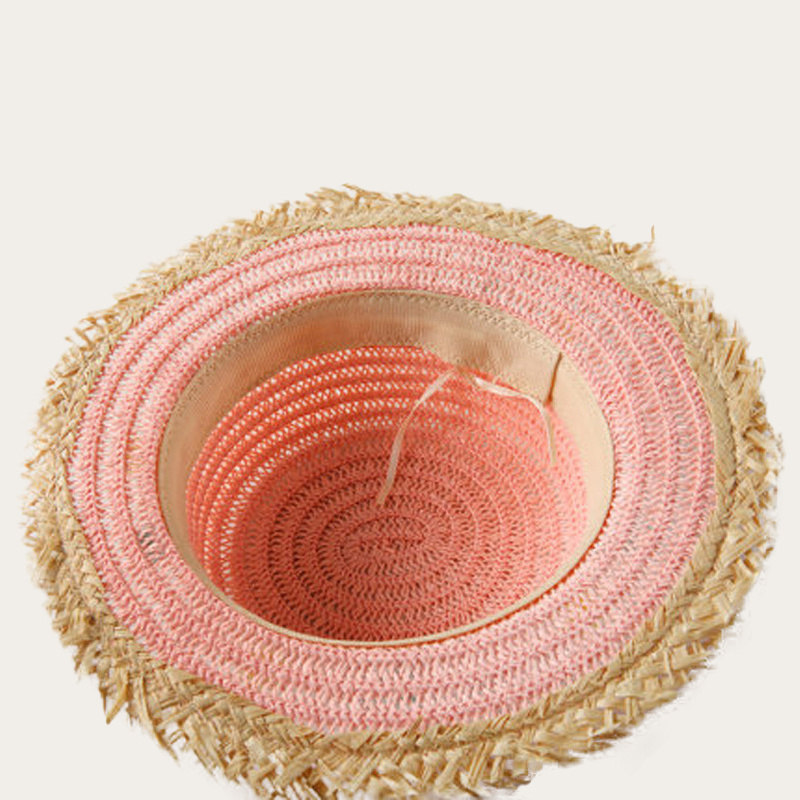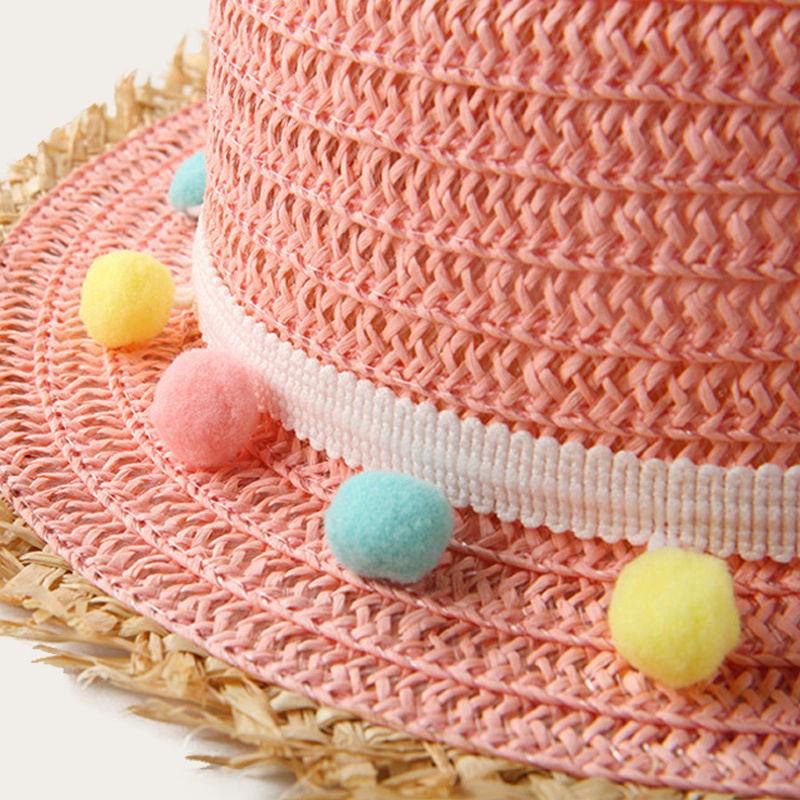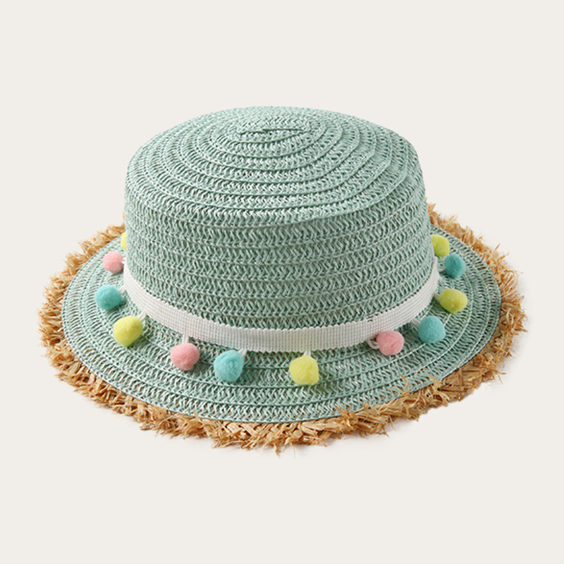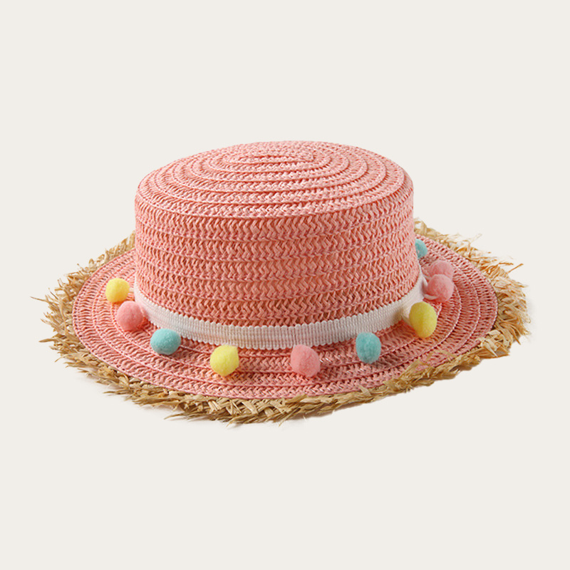 Children's flat straw hat, brim with rough edge design, with colorful ball decoration belt, simple and lovely for summer travel sunshade sunscreen.