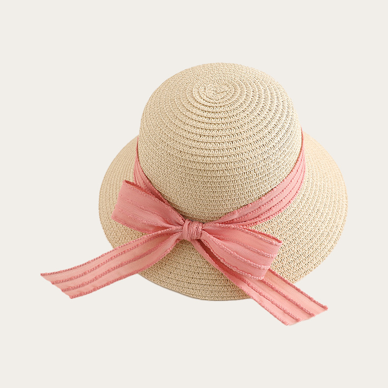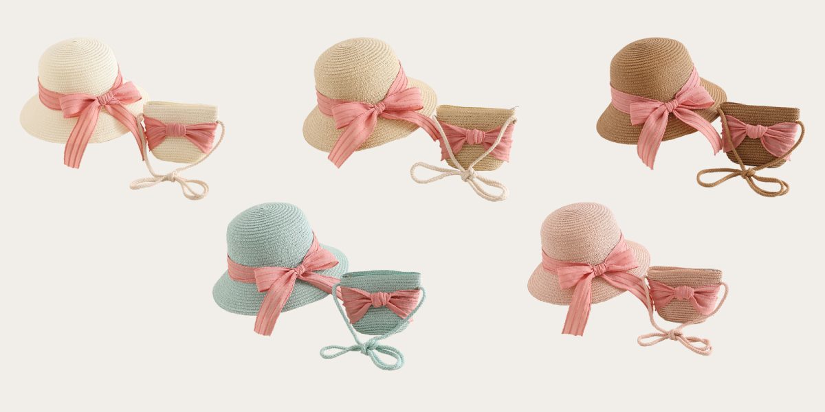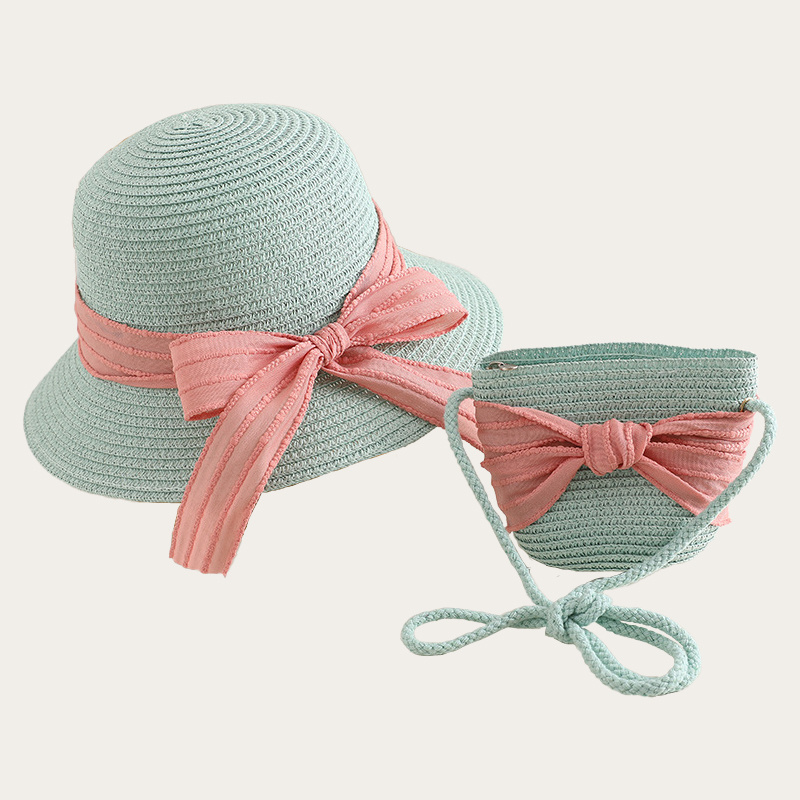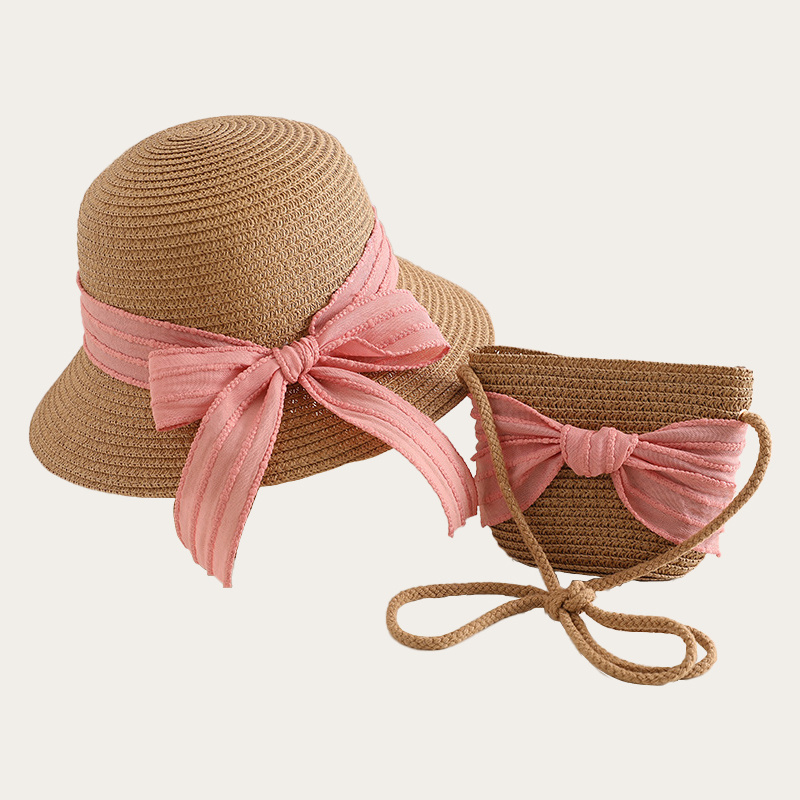 Summer new ribbon pink bow-tie straw hat baby girl set, big hat brim straw hat with bag suitable for summer travel with simple and lovely.