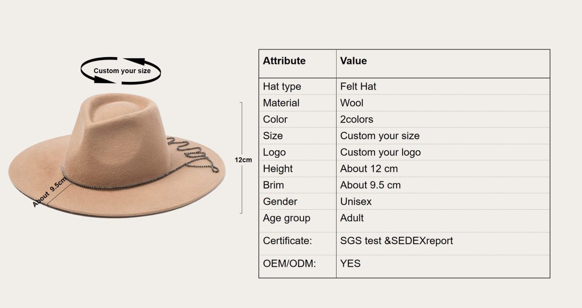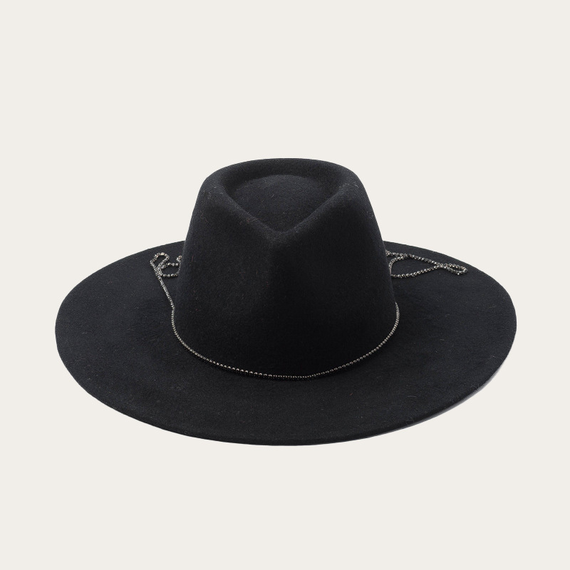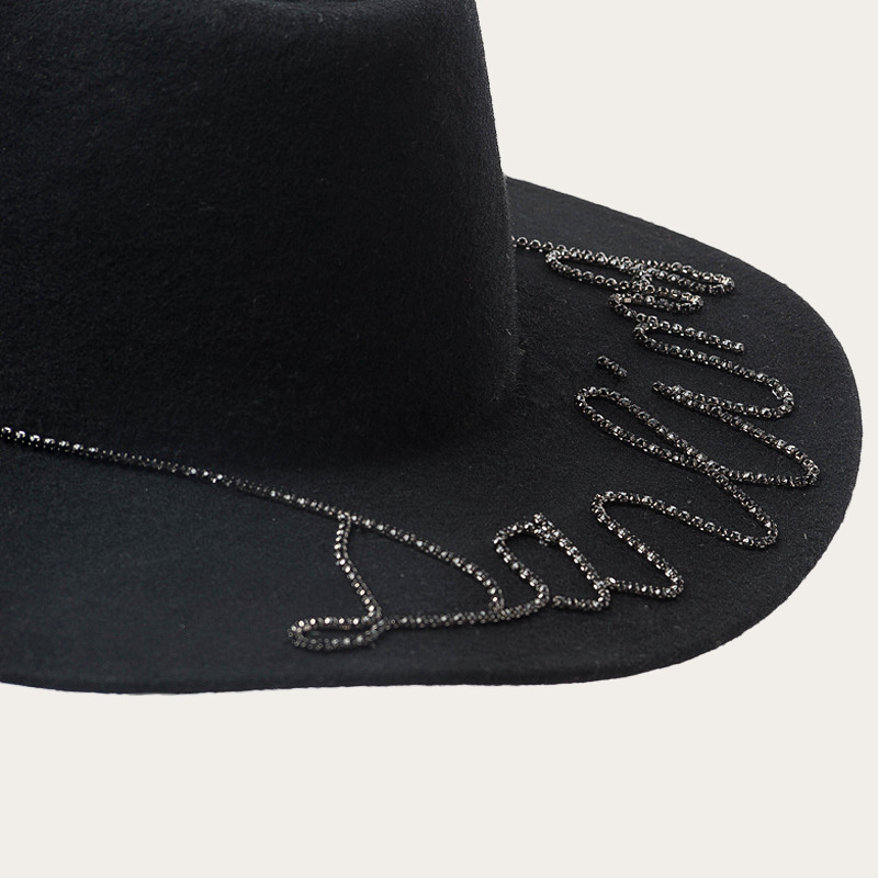 This felt hat is made of high quality warm 100% wool felt material. It's warm and stylish, making it a great gift for friends or family. It features a stylish diamond-trimmed hat band that keeps you comfortable and stylish! It's the perfect accessory for all seasons.