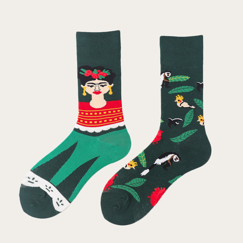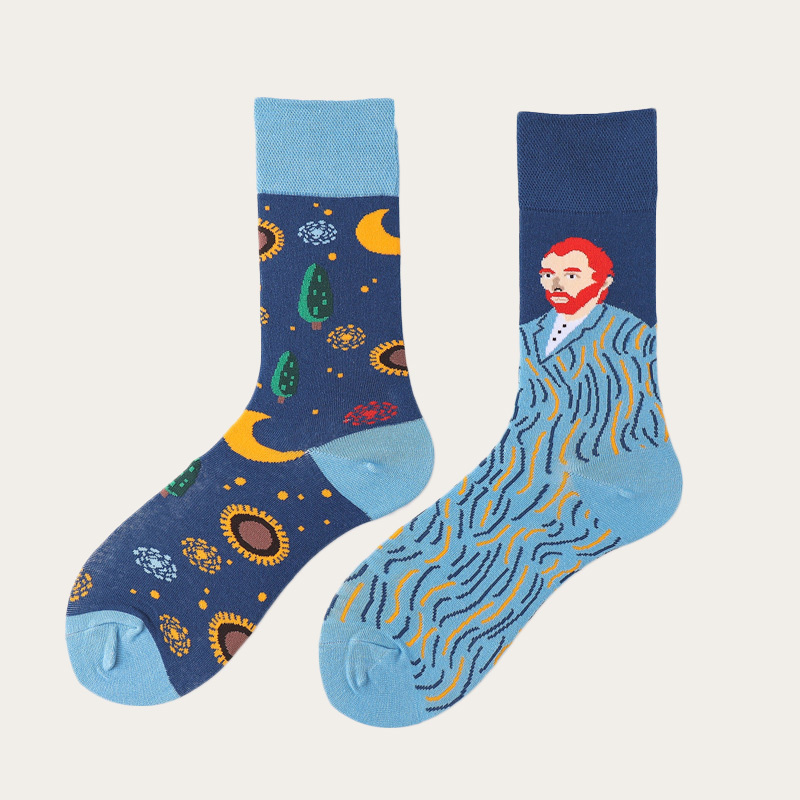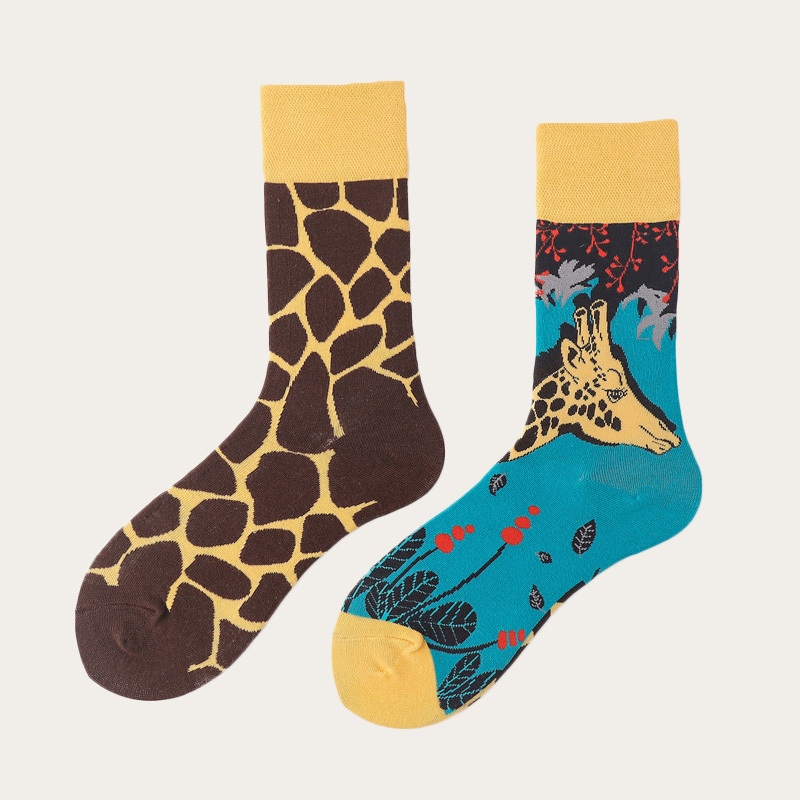 The two patterns of this pair of socks are different, but they have something in common. They are stylish and characteristic.
