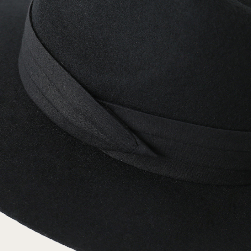 This flat-brim fedora is an outdoor fashion hat with a black bow decoration. It features a foveal crown and wide flat eaves that protect against the sun's harmful ultraviolet rays.
